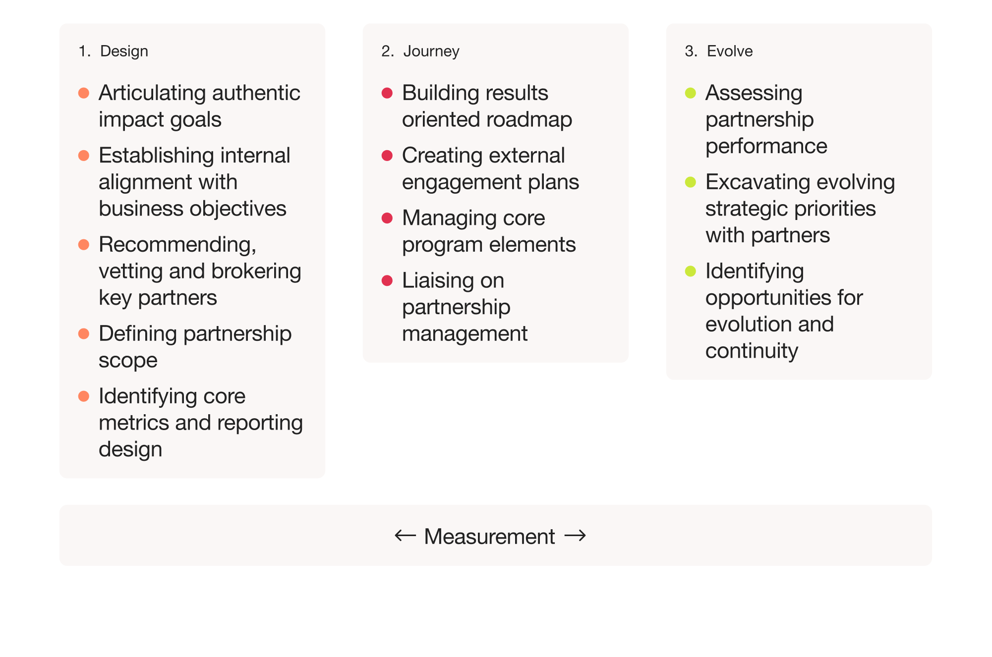 I work with brands to design and launch strategic impact initiatives that live in lock step with business objectives. I can help architect new partnership programs or evolve existing ones to support your brand in making a meaningful difference.